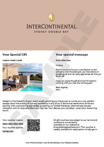 - Gift vouchers can be redeemed against any room night purchases only at InterContinental Sydney Double Bay.